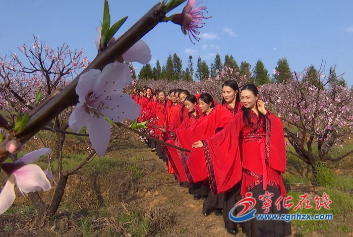在城郊鎮曹家屋村,這里桃花盛開,芬芳燦爛。寧化縣旗袍文化協會組織會員們身穿古裝來到這里踏青賞花。隨著人們對傳統文化日趨重視,在節日里人們穿漢服出行游玩,正逐漸形成了一種新的“時尚”。