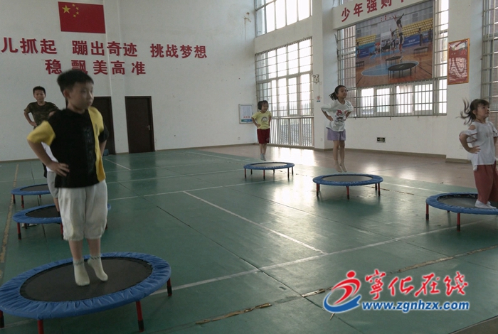 練習結束后,孩子們在老師的指導下在蹦床上進行叉腰跳、貼臂跳等基本跳,整個現場沉浸在輕松歡快的氛圍中。