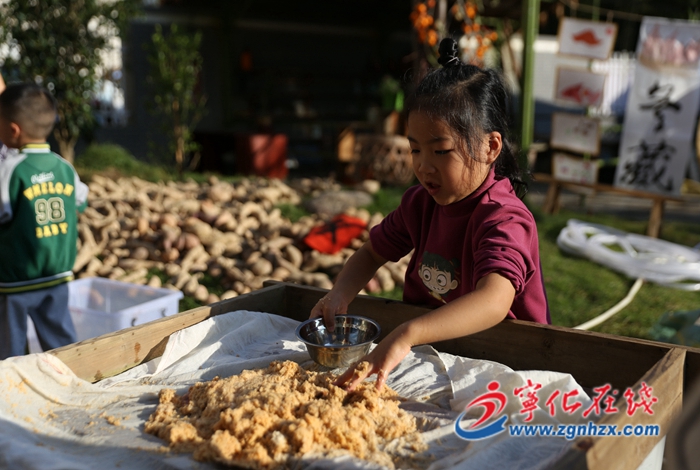 除了美食區外,還有各種體驗區,磨黃豆、打谷、挑谷......豐富多彩的體驗活動進一步滿足了孩子對大自然的好奇心和探究欲。