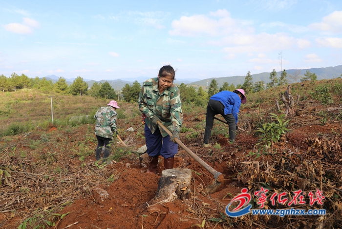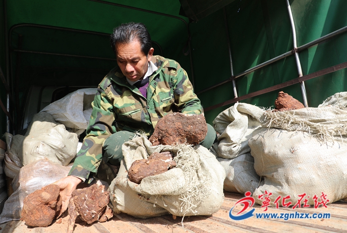 11月15日,寧化湖村鎮龍頭村茯苓種植基地內,10多名村民手握鋤頭,小心地將藏在“松樹蔸”周邊的茯苓采挖出來,裝袋后運往山下。