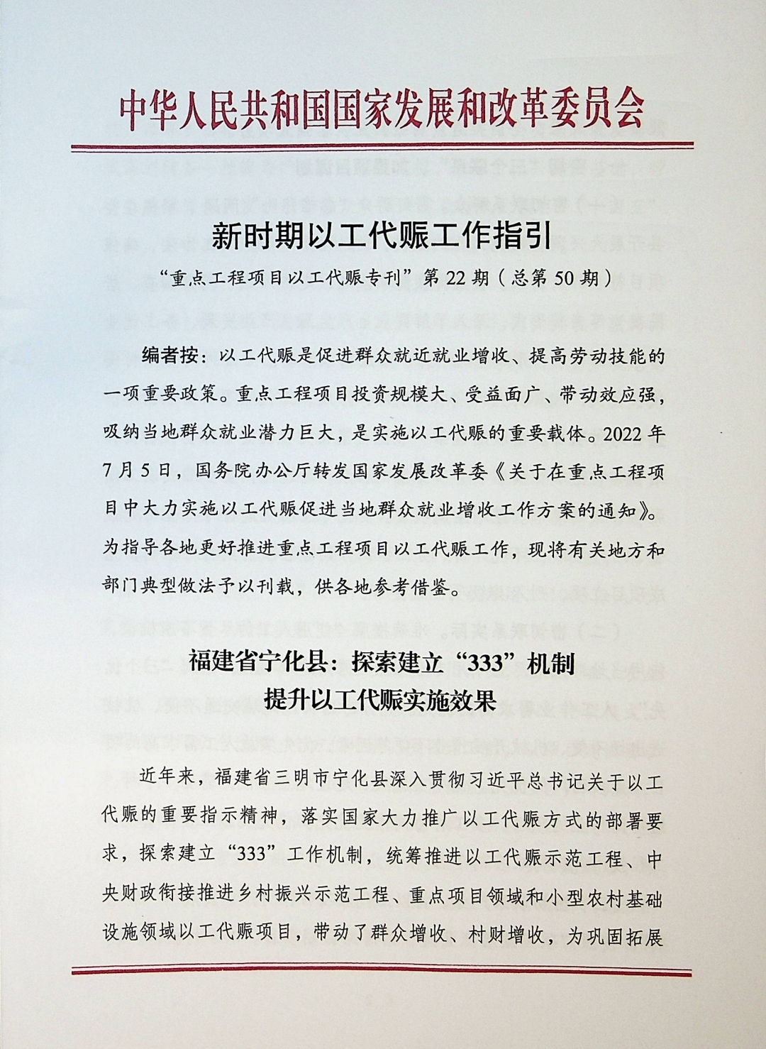 日前,國家發(fā)改委印發(fā)政策指引,向全國推廣寧化縣建立“333”工作機制、提升以工代賑實施效果的經(jīng)驗做法。省發(fā)改委專題轉(zhuǎn)發(fā),要求全省各地市、省市有關(guān)部門學習借鑒寧化縣典型做法,全面提升以工代賑政策成效。