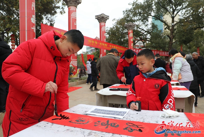 翠園廣場一側,寧化五中20多名師生正凝神屏氣地站在書法桌前筆走龍蛇,將自己對新春的祝福和對生活的熱愛融入筆墨之間。“我們準備了上百條春聯供大家選擇,根據市民的需求進行書寫,隸書春聯特別受歡迎。”教師賴春林是福建省書法家協會會員,現場揮毫潑墨30多副對聯,雖累得手酸背痛,但看到大家這么喜歡自己的書法,感覺特別開心。