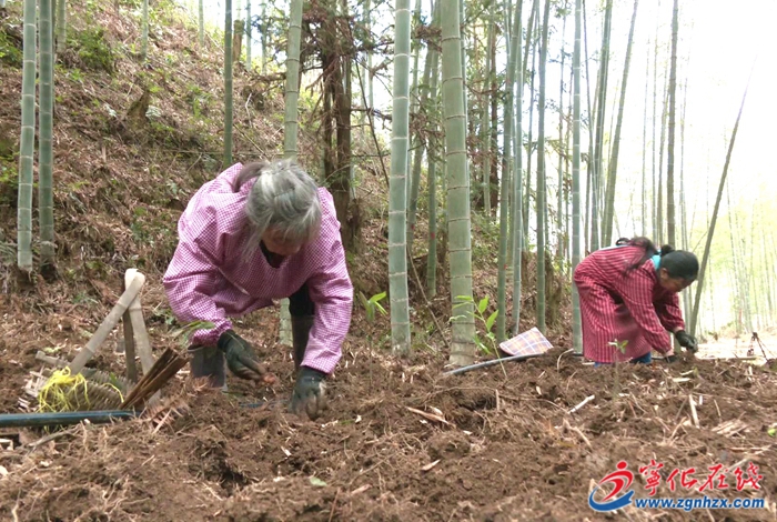 在城南鎮綠森家庭林場黃精種苗基地,記者看到十余名村民手持鋤頭翻地、培土、起壟、挖坑、下苗,一派忙碌景象。