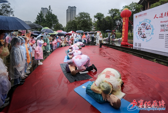 活動現場,共組織7名紅十字救護師資開展“救在身邊+生命教育”行動,為親子家庭現場演練心肺復蘇應急救護技能,并指導家長孩子學習操作。擺放了心肺復蘇操作流程、氣道異物梗阻操作方法、紅十字“三獻”工作、紅十字志愿服務等宣傳展架,發放“人人學急救,急救為人人”宣傳冊300余份。賦欣幼兒園120名小朋友還為現場觀眾表演“春夜喜雨”節目,并組織親子家庭在背景墻上打卡簽字、拍照留念宣傳。