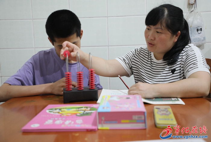 雖然小張長得人高馬大,但思想還跟小學生一樣幼稚。“想出去玩了是不是,那我們先坐下來,吃顆棒棒糖,再學算數,好不好?”看著多動的小張,廖秋香放下手中的教具,掏出一顆棒棒糖遞給小張,柔聲細語地說。看到老師和藹的笑臉,小張乖乖地進屋重新坐下,笑了笑,不說話。