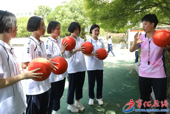 “正面對正來球方向,兩腳開立稍寬于肩,腳跟微起,兩膝彎曲稍內收的準備姿勢……”9月6日,寧化一中田徑場上陽光明媚,青年教師張毅婷正在給高一新生上排球課,指導學生練習正面雙手墊球等動作。