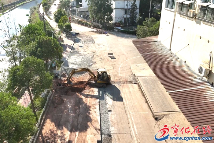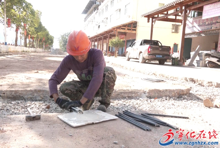 在水茜鎮集鎮道路修建項目現場,工人們正在進行路邊欄桿、路沿石抬高、破損路面拆除恢復等工作。?