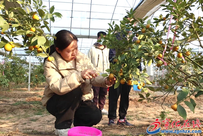 “今年剛剛投產(chǎn)的脆蜜金柑三代口感很好,種植面積六、七畝左右,共500余棵樹。十一月份到正月是采摘季,碰上周末高峰期收入會在7000~8000元。”采摘基地負責人周國元介紹。