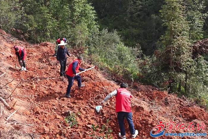 植樹現(xiàn)場,林業(yè)技術人員與國網寧化縣供電公司勞模、共產黨員服務隊、先進等人員協(xié)同作業(yè),栽種下三年生油茶大苗。