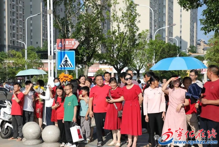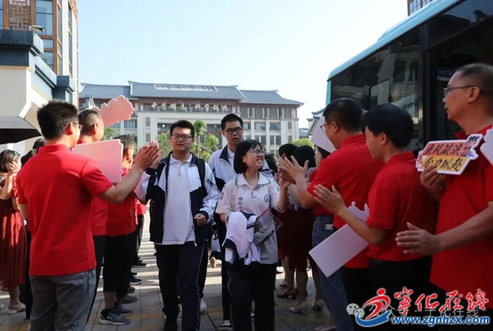 上午7點(diǎn)半,寧化縣濱江實(shí)驗(yàn)中學(xué)校門口,9輛“愛心送考”公交車早早地停靠在校門口,免費(fèi)為考生提供接送服務(wù)。家長和老師們化身應(yīng)援團(tuán)“花式”送考:老師們身著喜慶的紅色T恤,手持寫有“金榜題名”“全力以赴”“高考必勝”等字樣的應(yīng)援牌列隊(duì)歡送,為每一位學(xué)子擊掌鼓勵(lì),傳遞信心與力量。家長們準(zhǔn)備了旗袍、花束、條幅等讓人目不暇接,滿滿氛圍感。