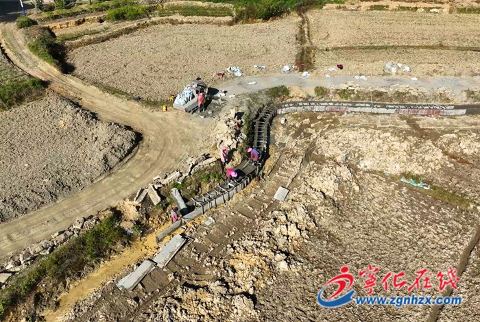 在石壁鎮紅旗村高標準農田建設現場,工人們忙著修筑溝渠,一派繁忙的建設景象。
