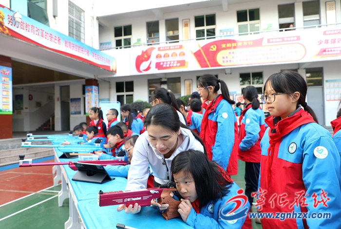 在互動環節中,射擊世界冠軍、全運會冠軍李雪艷分享了自己逐夢賽場的成長故事,現場指導師生體驗光電射擊的樂趣,點燃師生的運動熱情。設置在操場的體育競技區、射擊體驗區、客家文化展示區三大區域同步開放。學生積極參加乒乓球托球接力、障礙運球、趣味拔河等運動,體驗客家剪紙與木活字印刷等非遺文化。