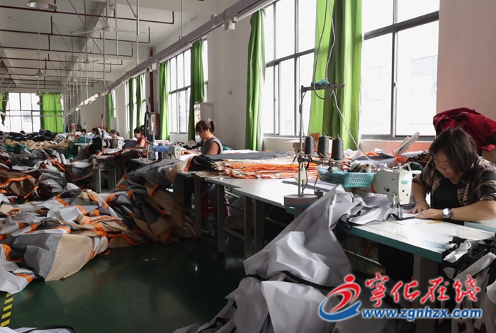 近日,在客步戶外用品公司的生產車間,工人各司其職,有條不紊地進行裁床裁切、半成品組裝等工序,全力趕制訂單。