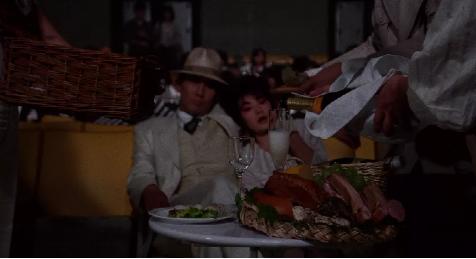 影片的開頭就極具黑色荒誕喜劇的意味,一個(gè)身穿白衣服的男人帶著女友,在電影院里看電影,直面鏡頭說著自己最討厭看電影的時(shí)候被打擾。但在他前面卻擺著一張折疊桌子,上面有色彩繽紛的西式腌火腿、色拉,冰桶里還有香檳酒。之后真的有人吃洋芋片和擠包裝袋,發(fā)出噪音,畫面極具諷刺意味。