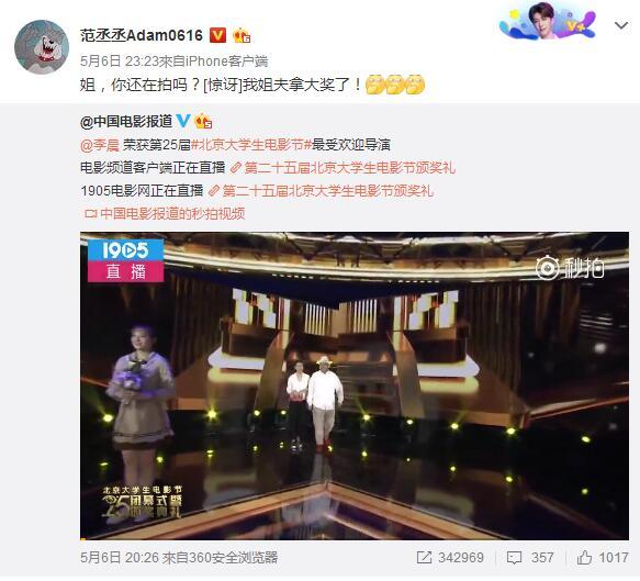 搜狐娛樂訊 5月6日,第25屆北京大學生電影節(jié)在京召開,李晨榮獲“最受歡迎導演 ”獎,隨后范丞丞轉發(fā)并配文道:“姐,你還在拍嗎?我姐夫拿大獎了!”疑似坐實二人好事將近!