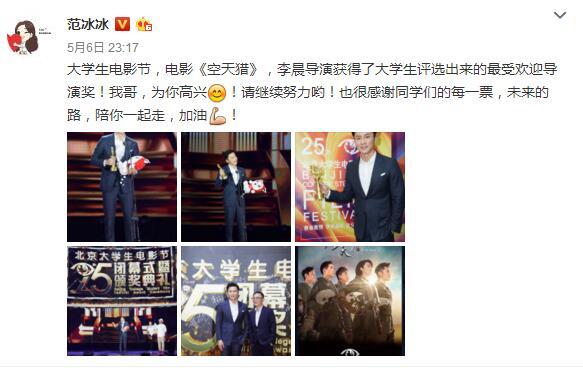 李晨得獎后,范冰冰也在自己微博發(fā)文祝賀并暖心表白:“大學生電影節(jié),電影《空天獵》,李晨導演獲得了大學生評選出來的最受歡迎導演獎!我哥,為你高興!請繼續(xù)努力喲!也很感謝同學們的每一票,未來的路,陪你一起走,加油! ”