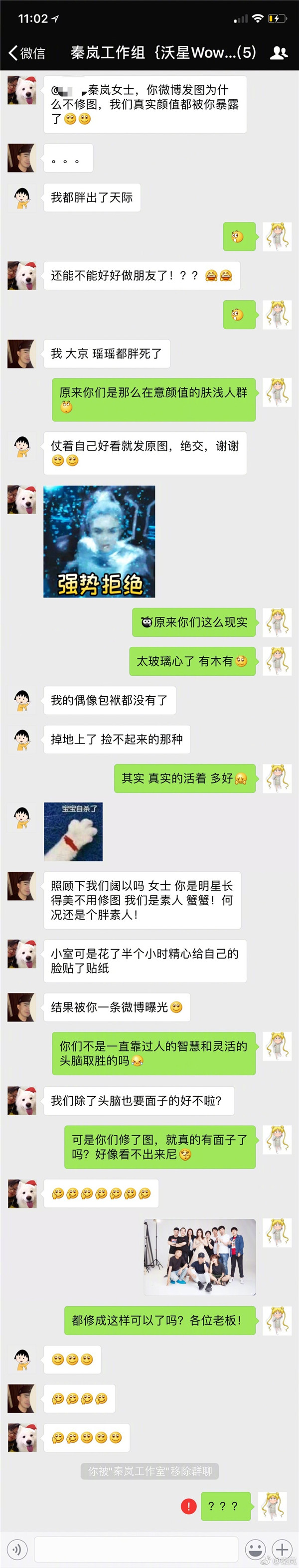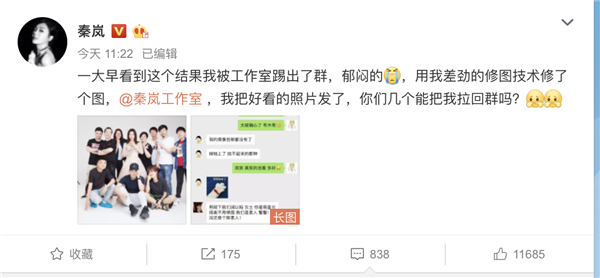 秦嵐微博發布與工作室小伙伴們的對話截圖:“一大早看到這個結果,我被工作室踢出了群,郁悶的,用我差勁的修圖技術修了個圖,@秦嵐工作室 ,我把好看的照片發了,你們幾個能把我拉回群嗎?” 原來因為發布工作大合影不修圖,被工作室成員輪番吐槽,最后竟然被工作室踢出群。隨后,秦嵐在評論中回復網友,為了能回到大家的懷抱,認錯態度較好,并把圖認認真真的修了一下,濾鏡之后還磨了皮,現在已經被拉回群了。