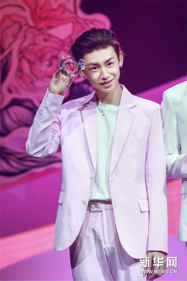 發布會開場后,主持人李響與粉絲互動暖場。屏幕中顯示描述各個成員的亮點關鍵詞,主持人引導猜測,引得粉絲們連連高呼,迎接他們上臺。NINE PERCENT成員身穿粉白色系西裝登臺亮相,與同色系的舞美交相呼應。其中,成員小鬼王琳凱更是以swag感十足的方式和大家打招呼。