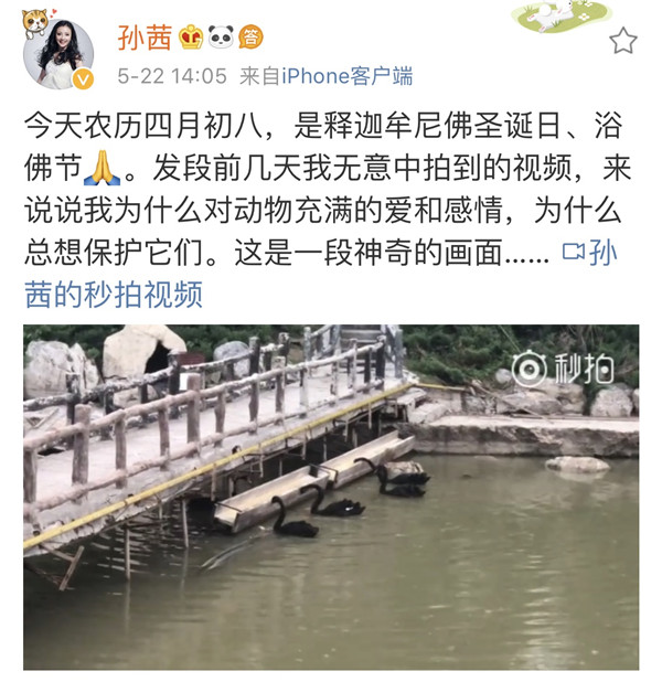 5月22日孫茜微博寫到:“今天農歷四月初八,是釋迦牟尼佛圣誕日、浴佛節。發段前幾天我無意中拍到的視頻,來說說我為什么對動物充滿的愛和感情,為什么總想保護它們。這是一段神奇的畫面”。 視頻中每只黑天鵝身邊都圍繞著幾條錦鯉,黑天鵝一直把自己的食物從食槽中銜出來喂給湖里的錦鯉。孫茜在視頻中打趣道:好像媽媽在喂孩子一樣。并且呼吁大家善待動物,要愛護他們,動物也是有情感的。