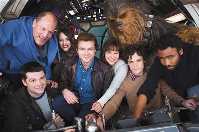 《星球大戰(zhàn)外傳:游俠索羅》眾主創(chuàng)在“千年隼號(hào)”上合影。