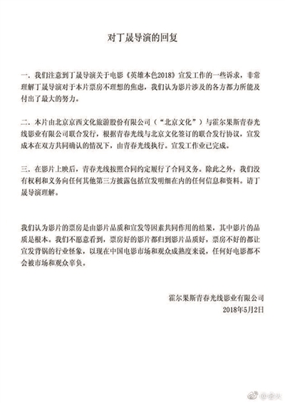 對此,“光線”方面的回話沒有讓步,以票房不好不能怪宣發,而是與影片質量有關,進行暗諷。此回話在宣發圈里確實獲得了一些共鳴,畢竟,電影爛片讓宣發來背鍋的事情也不鮮見,而且丁晟對于票補的公開也不是什么光彩之事。于是,這一回合,雙發一來一往打了個平手,在當時《后來的我們》正鬧退票風潮,關于此事的聲音很快就消退了。