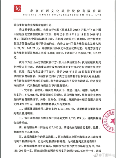 幾天后,出品方之一“北京京西文化”再次出手,發文直指“霍爾果斯青春光線影業”,讓其說明3700萬費用到底用在了哪里,而且還列出了一些明細的費用,把平時秘而不宣的內容擺在了臺子上,讓人們見識了一部電影上映前需要花掉多少錢,這些錢又是怎樣發揮效力“買”來高票房的,比如,新媒體費用153萬、票務補貼費用1000萬等等。