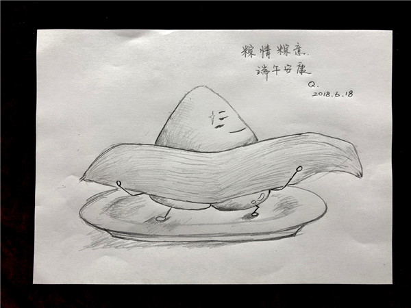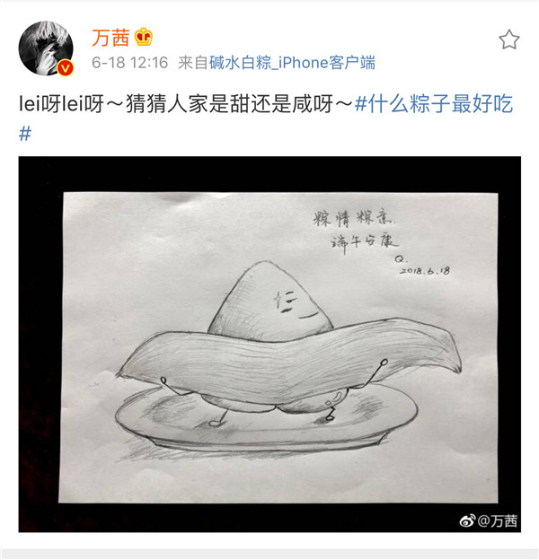 6月18日,正值端午佳節,萬茜微博曬出一張手繪Q版粽子圖。只見照片中的粽子在“漫畫小能手”萬茜的筆下,多了些呆萌的微表情,萌態十足。萬茜還在圖中寫下祝福語“粽情粽意,端午安康”,字體端莊大氣,畫作惟妙惟肖。