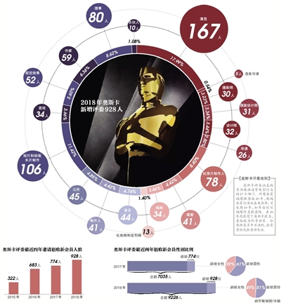 作為奧斯卡的主辦方,美國電影藝術(shù)與科學(xué)學(xué)院每年都會招收大量新會員,近日,奧斯卡主辦方公布了2018奧斯卡評委獲邀名單,邀請928位新成員。為了緩和最近幾年關(guān)于“奧斯卡評委中白人男性過多,女性和有色人種過少”的指責(zé),這次新邀請名單男女比例為51:49,非白人占比達38%,若全員接受邀請,總數(shù)將達9226人,女性評委比例增至31%。
