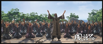 影片中建筑的結構、材質盡量往舊了做,不會那么新,但是不往臟了處理,所以觀眾就感覺是非常實在的中國元素,“那個村”里所有的造型,所有的美術風格都是借鑒了四千多年前的三星堆文化遺址。電影中的服飾也摒棄了手游中那種浮夸的中國風,而是往實了做,男主角朗明穿得臟兮兮的,衣服上還有補丁,但觀眾都覺得是一種東方的生動。