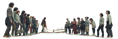 不甘心的張總找到一處大船殘骸,在這里有文明的“遺產(chǎn)”:現(xiàn)代社會里的紅酒、雪茄、洗澡水、毛巾、大型漁網(wǎng),和重新發(fā)行通行貨幣:撲克牌。當(dāng)人群抵達,使用打火機的同伴先于燧木取火的人一步點燃火光,故事翻開了資本主義社會的篇章。