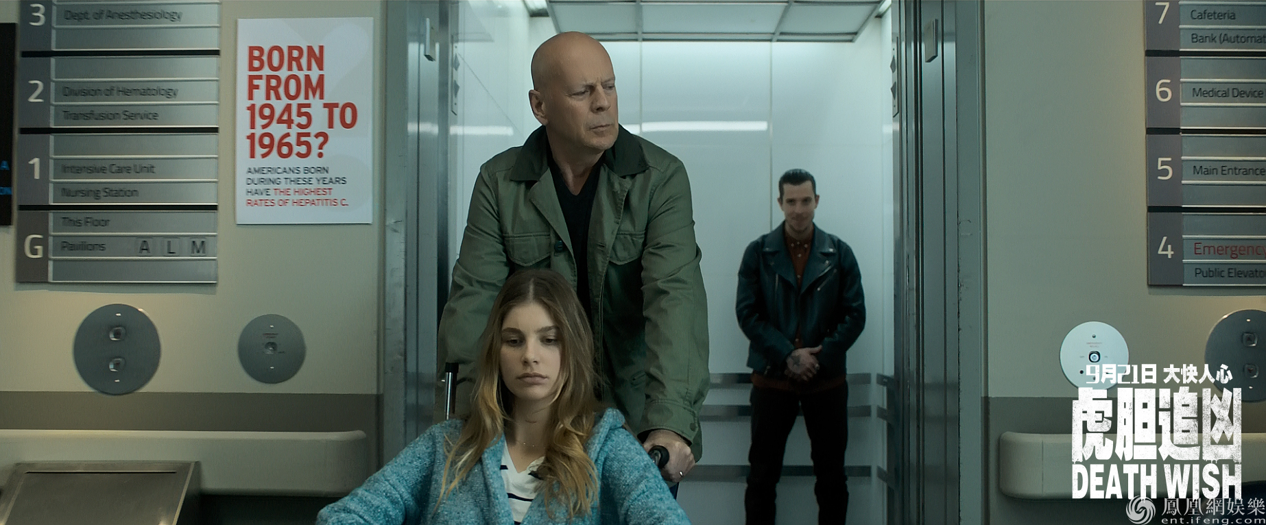 此次發布的海報整體風格冷暖兩色,雙重身份的布魯斯·威利斯位處中央,“天使”醫生在前,眺望遠方手指比槍;“死神”帽衫男在后,目色冷峻緊握鋼槍。圍繞在他身邊的,是一幕幕片中重要的情境和角色。海報暖色處是原本幸福的主人公保羅一家人,以及昏迷的女兒和身背獵槍的外公。冷色處,則是躲在陰暗角落里的暴力罪犯們,以及被綁架的女兒。而在連接冷暖的中間地帶,是勘案調查的兩位警察。