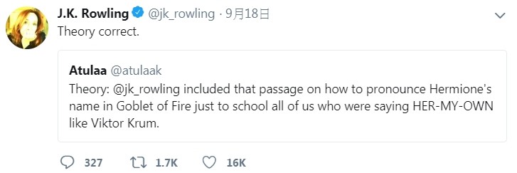 有網(wǎng)友近來(lái)便在推特詢(xún)問(wèn)J.K.羅琳,是不是故意安排這段劇情,教粉絲如何正確想出“Hermione”,因?yàn)椴簧偃藭?huì)想成“Her-my-own”,沒(méi)想到J.K.羅琳回復(fù)“這個(gè)理論是正確的”。