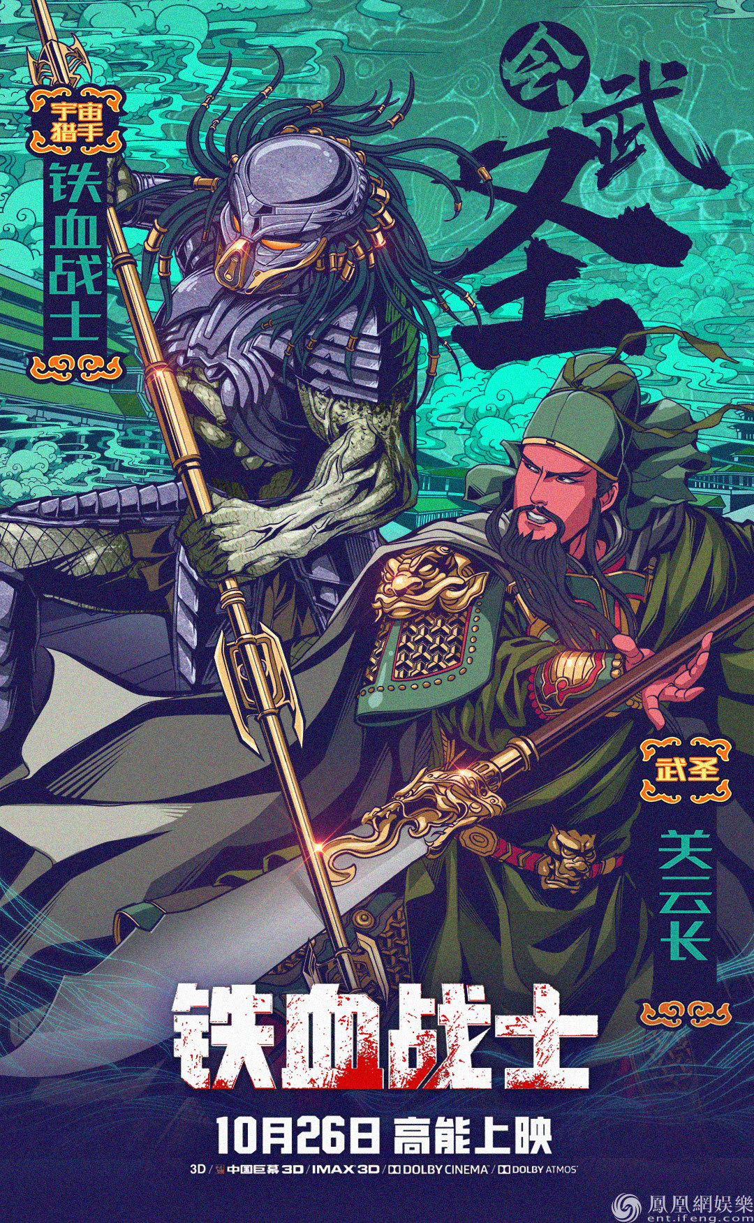 第二張海報中,在《三國演義》中過五關斬六將、溫酒斬華雄、刮骨療毒,被譽為武圣的真漢子關羽手拿青龍偃月與鐵血戰士對抗。作為為戰斗而生的種族,鐵血戰士不僅熱武器有著高科技的前瞻性,對于冷兵器的使用同樣駕輕就熟,而且他們在受傷后也有自愈手段,過程同樣是在痛苦中完成。畫面中的鐵血戰士手拿鐵血戰士標志性武器鏖戰武圣,兩位戰爭狂人的相遇,或許會讓人更加明白“鐵血”二字的終極奧義。