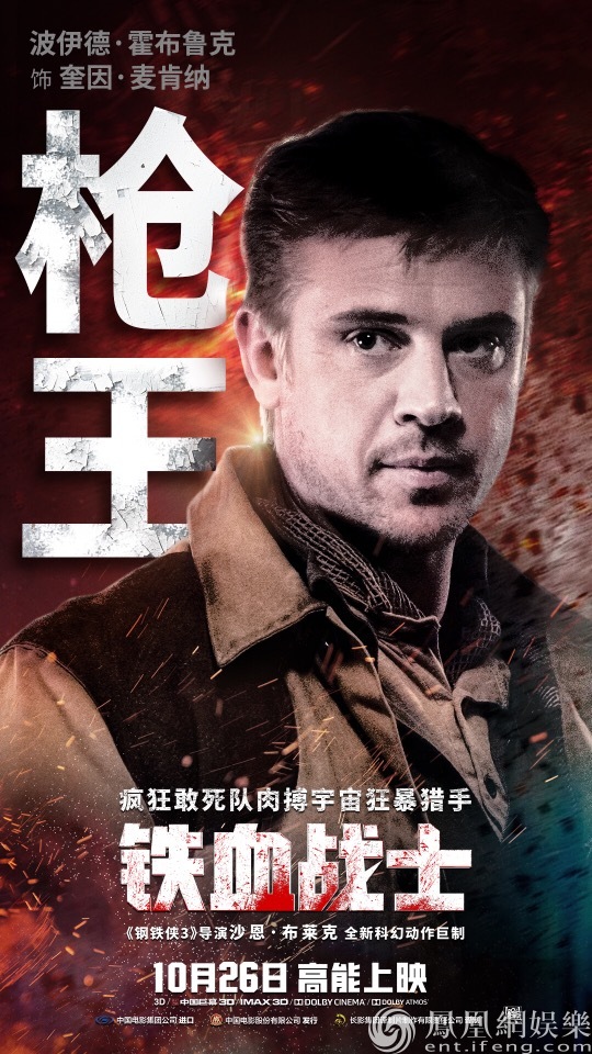 在官方同時發布的角色海報中,每位戰士都身著戰斗服身處戰火之中,眼神或堅毅或略顯不羈。最瘋戰隊的領頭人是奎恩•麥肯納(波伊德·霍布魯克飾代表作《金剛狼3》),身為陸軍狙擊手的他自然是隊內當之無愧的“槍王”、名副其實的狠角色。影片中不僅有他精準的射擊、強火力對轟幫助隊伍完成重要的擊殺任務,作為推動劇情的關鍵人物,他也貢獻了與鐵血戰士貼身肉搏的精彩場面。