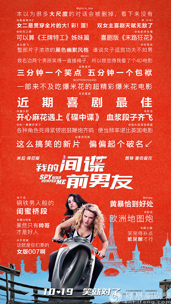 奧黛麗(米拉·庫尼斯飾)和摩根(凱特·麥克金農(nóng))這對美國姐妹花,由于機(jī)緣巧合被卷入一場國際陰謀,全程開掛與各路間諜殺手斗智斗勇,高能不斷的反轉(zhuǎn)和緊張刺激的動作戲讓影迷十分過癮,將電影比作“逗比版007”,更有影迷真情實(shí)感的表示“一分鐘都不想錯過這部電影”。影片中的笑料也層出不窮,兩位間諜姐妹花從不按套路出牌,意料之外情理之中的驚喜為影迷帶來前所未有的爽感,不少影迷走出影院時仍沉浸在爆笑的劇情中,強(qiáng)力安利電影“誰看誰知道”,還有許多影迷被電影幽默爆笑的氣質(zhì)所影響,在講述自己喜歡電影的原因時也化身金句頻出的段子手,有一位女性影迷表示:“奧黛麗和摩根不需要任何的男人,非常的酷炫”,還有一位男影迷笑稱:“看就對了,男人不值得”。