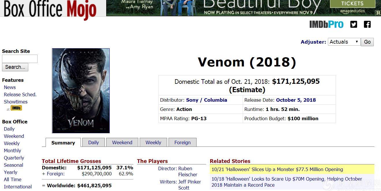 《毒液:致命守護者》上映三周,票房持續增長,多國保持票房冠軍位置。目前全球票房累計已達4.61億美金,其中北美票房取得1.7億美金的好成績。同時影片下月將登陸日本、中國兩大亞洲重要的市場,票房數據有望再次刷新紀錄。對于一部沒有任何前作基礎的超級英雄電影來說,這個成績可以說十分亮眼。