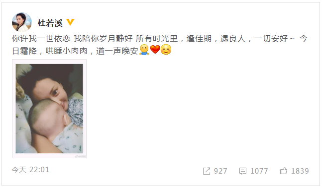 10月23日晚,杜若溪通過微博曬哄女兒睡覺的照片,并配文稱:“你許我一世依戀,我陪你歲月靜好。所有時(shí)光里,逢佳期,遇良人,一切安好!今日霜降,哄睡小肉肉,道一聲晚安!”