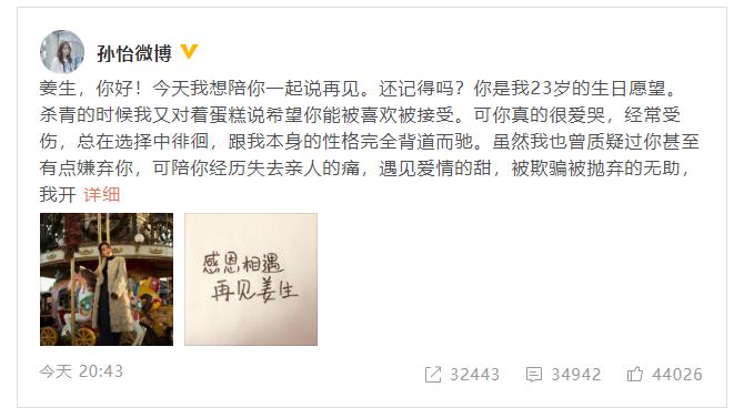 電視劇《涼生,我們可不可以不憂傷》已于昨晚迎來(lái)了大結(jié)局,姜生的扮演者孫怡在自己的社交賬號(hào)上寫長(zhǎng)文,動(dòng)情追憶姜生。
