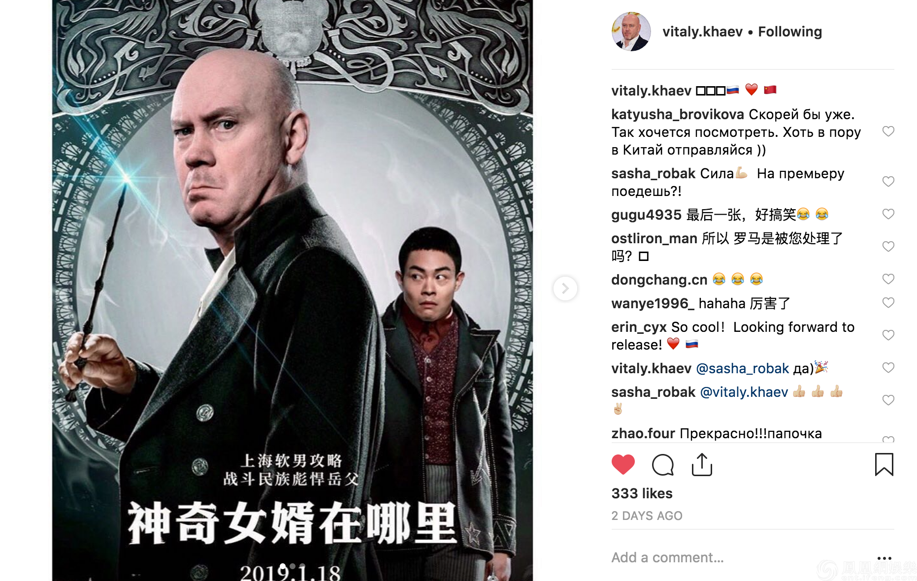 戰(zhàn)斗民族在網(wǎng)絡(luò)中一直是畫風(fēng)神奇的存在,電影《戰(zhàn)斗民族養(yǎng)成記》就是一段中國女婿遠(yuǎn)赴俄羅斯,拜見彪悍岳父的有趣故事。這次,網(wǎng)友發(fā)揮想象力,竟然讓這對組合在漫威、DC宇宙和魔法世界穿越。于是《神奇動物在哪里》變成“神奇女婿在哪里”,《毒液》變成“我的有毒岳父”。其p圖技術(shù)不僅獲得國內(nèi)網(wǎng)友認(rèn)可:“有史以來最剛岳父”,更是被因寡頭這個角色大受中國網(wǎng)友喜愛的——維塔利·哈耶夫,岳父本人認(rèn)證轉(zhuǎn)載,ins上的網(wǎng)友紛紛評論:“太酷”“已經(jīng)迫不及待想要看到電影了”,表達(dá)對原班人馬的喜愛與支持。