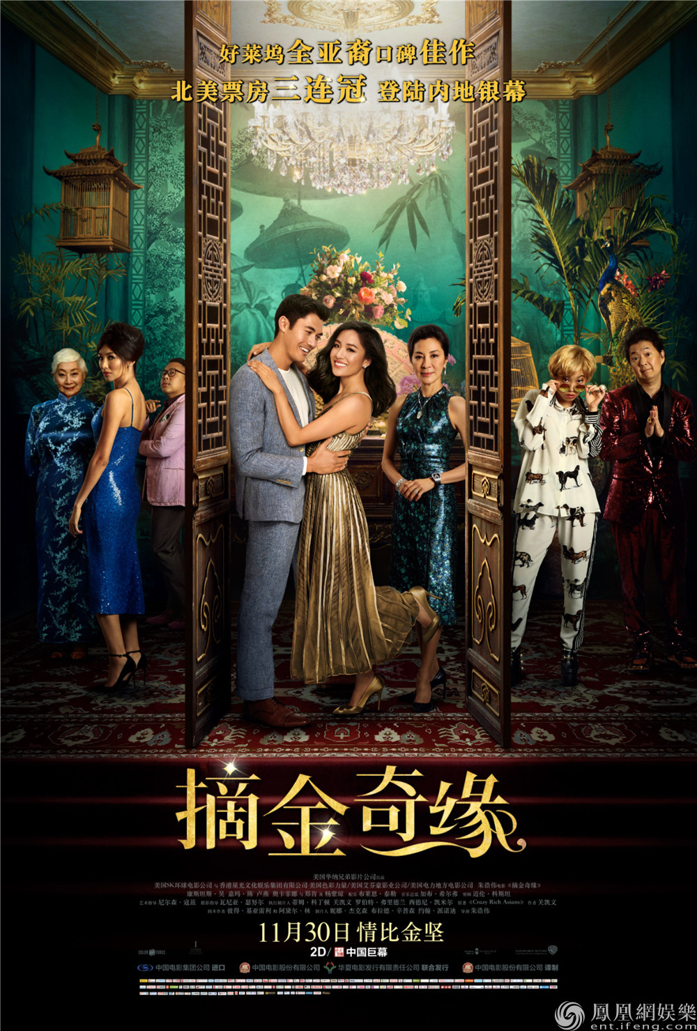 由華納兄弟影片公司出品,康斯坦斯·吳、楊紫瓊、亨利·戈爾丁等演員出演,改編自全球暢銷小說的好萊塢浪漫愛情喜劇《摘金奇緣》(Crazy Rich Asians) 將于11月30日正式在國內上映。影片目前在全球已取得超過2.3億美金的票房成績,成為了北美最近10年來票房最高的浪漫愛情喜劇,同時也是有史以來,票房收入第六高的浪漫愛情喜劇。