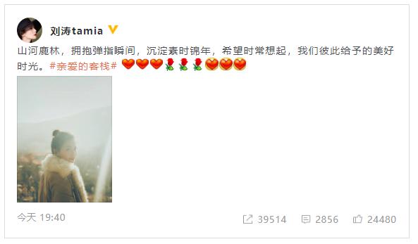 12月4日晚,《親愛的客棧》疑似已經殺青,劉濤通過個人社交賬號曬照,并發文表達不舍之情稱:“山河鹿林,擁抱彈指瞬間,沉淀素時錦年,希望時常想起,我們彼此給予的美好時光。”