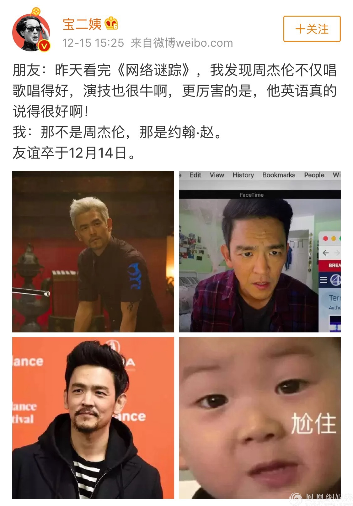 事實上,這不是約翰·趙第一次被說像周董了,就連權威電影數據網站IMDB收錄《青蜂俠》演員列表時都把他倆搞錯過。此前約翰·趙來華宣傳《星際迷航3》看到周杰倫的照片,還自我調侃道:“我老婆有次看到他照片,跟我說我們倆長得真的蠻像的,不過他長得比我帥,像是將來我做完第60次整容手術的樣子。”就連“天王嫂”昆凌也在ins上為約翰·趙的新作品打call,稱最愛《網絡謎蹤》這種猜不到結局的好電影。