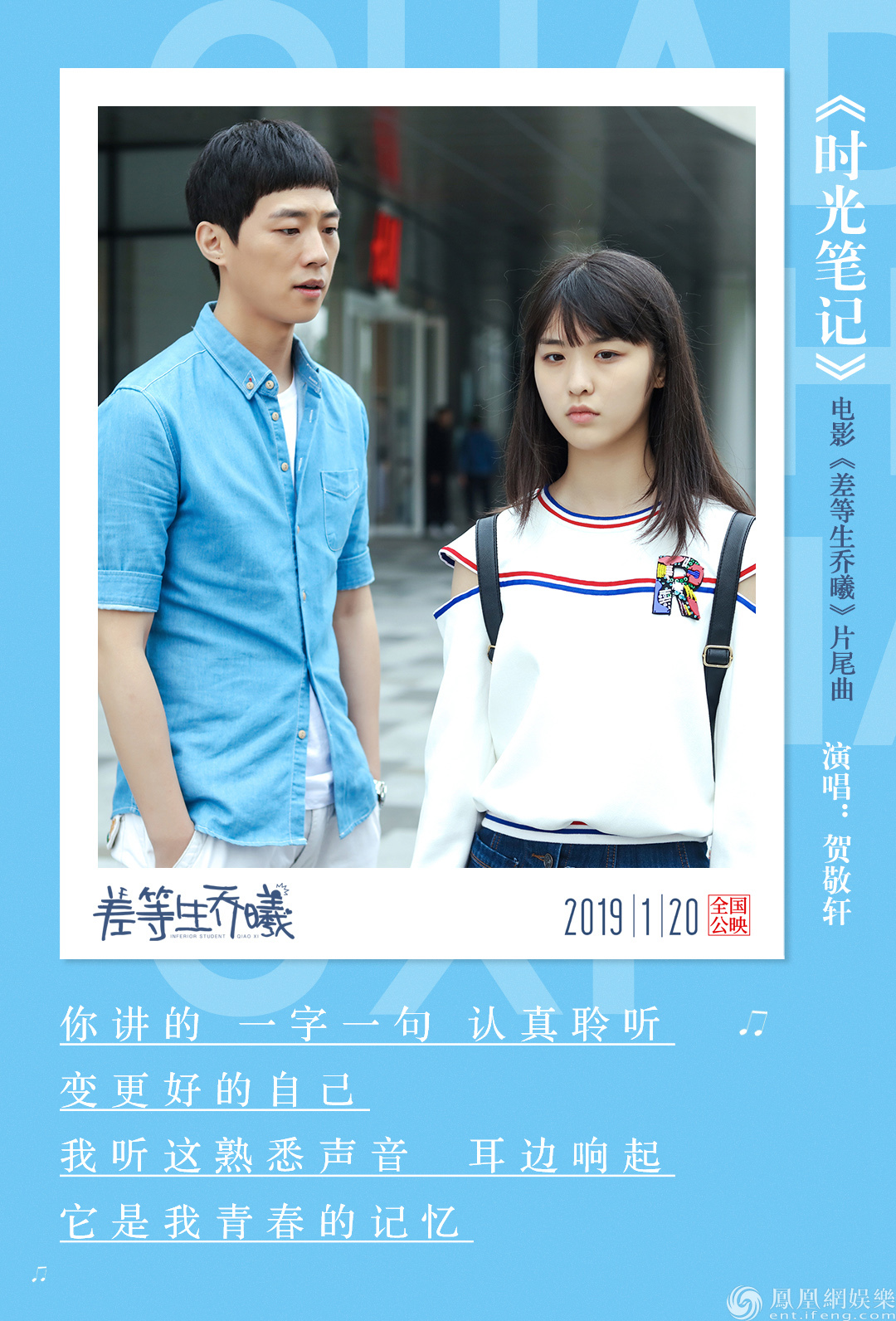 電影《差等生喬曦》演唱的片尾曲《時光筆記》由“元氣才女”賀敬軒獻唱。甜美的嗓音配以輕快的旋律,讓人有一張如沐春風的感覺,找回了青春年少時漫步在校園中的那份愜意。海報中曲蘭蘭(楊麗曉飾)和喬曦站在校園的操場上,曲蘭蘭看著喬曦,喬曦望向遠方,兩人臉上都掛著微笑,讓人覺得歲月靜好。
