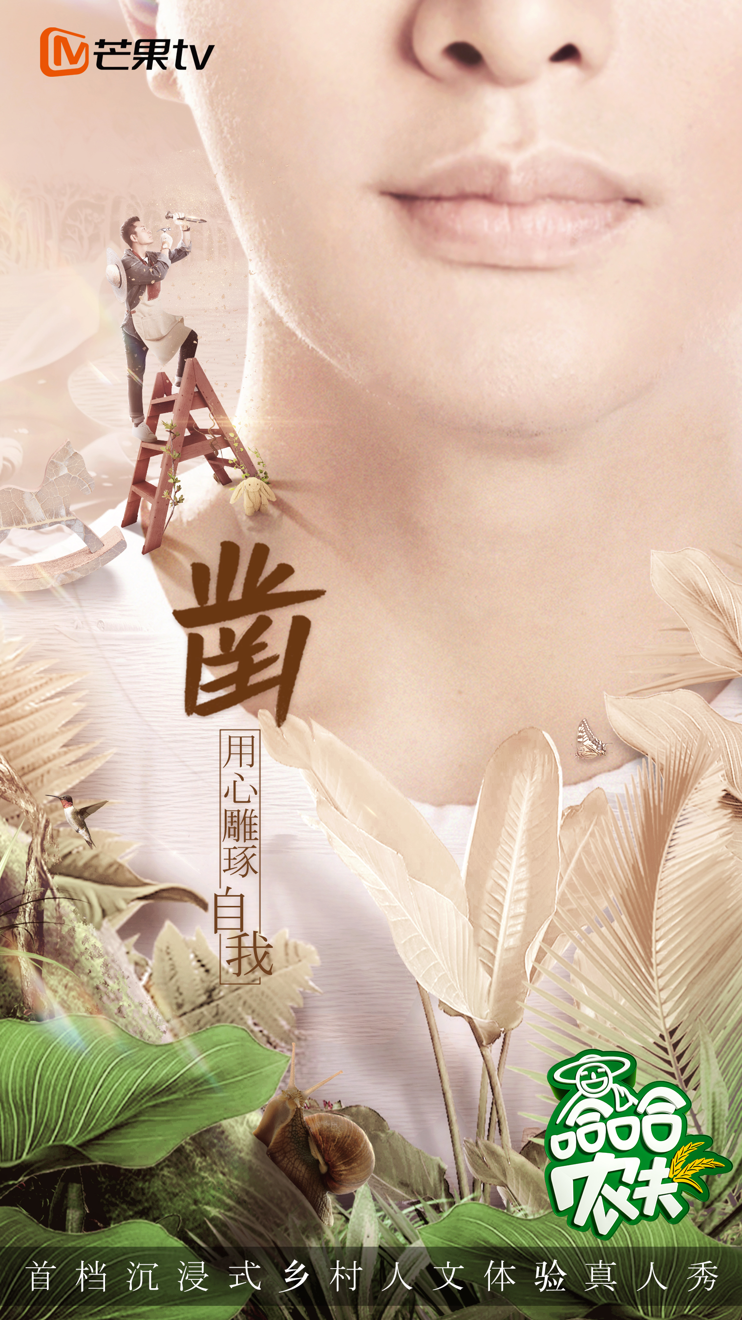 《哈哈農(nóng)夫》首張嘉賓懸念海報中,男性嘉賓的半張臉充滿半幅畫面,他肩膀上架著的人字梯上則是微縮版的自己,身著工服圍裙、手持錘和鑿,分明是一個木匠形象。海報文案“鑿:用心雕琢自我”一方面對應(yīng)了微縮小人手中的動作,另一方面似乎是在透露,這是一位不斷嘗試、在角色演繹中自我雕琢的演員。
