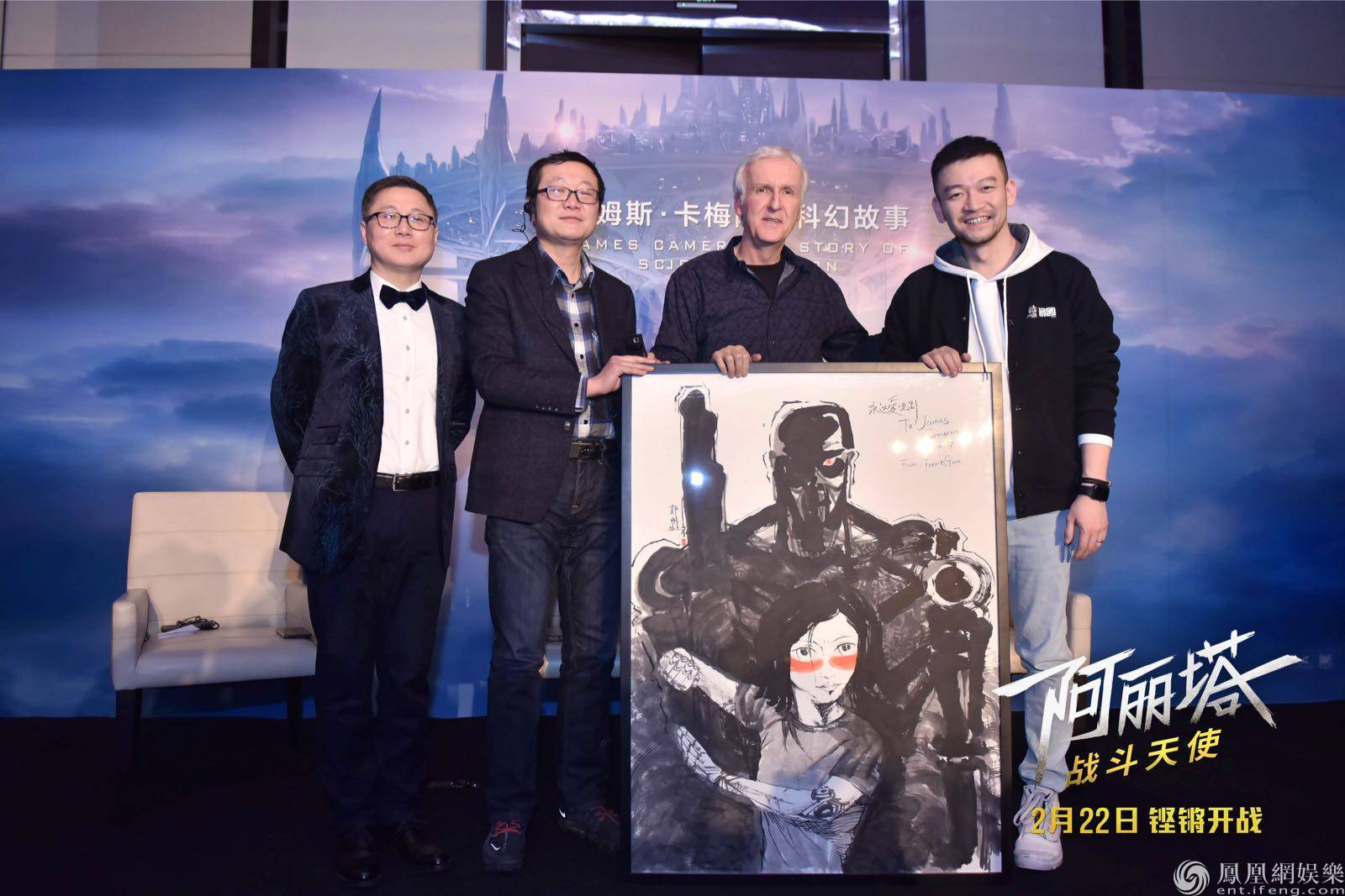 活動最后,電影《流浪地球》導演郭帆則從聽眾轉(zhuǎn)變?yōu)?ldquo;追星少年”,他帶來一副由自己與藝術(shù)家共同創(chuàng)作的水墨畫上臺送給偶像卡梅隆。畫面由卡梅隆電影中的經(jīng)典角色與中國傳統(tǒng)水墨畫相結(jié)合,畫中高大的機器人形象為電影《終結(jié)者2》中的經(jīng)典角色T800,而畫面下方則是《阿麗塔:戰(zhàn)斗天使》中的主人公阿麗塔,畫中一側(cè)由郭帆導演親筆題字:永遠愛電影。郭帆導演表示:“卡梅隆導演影響了我的科幻電影觀,感謝他的電影,同時祝福《阿麗塔:戰(zhàn)斗天使》票房大賣。”帶著郭帆導演的祝福,活動完美落幕。