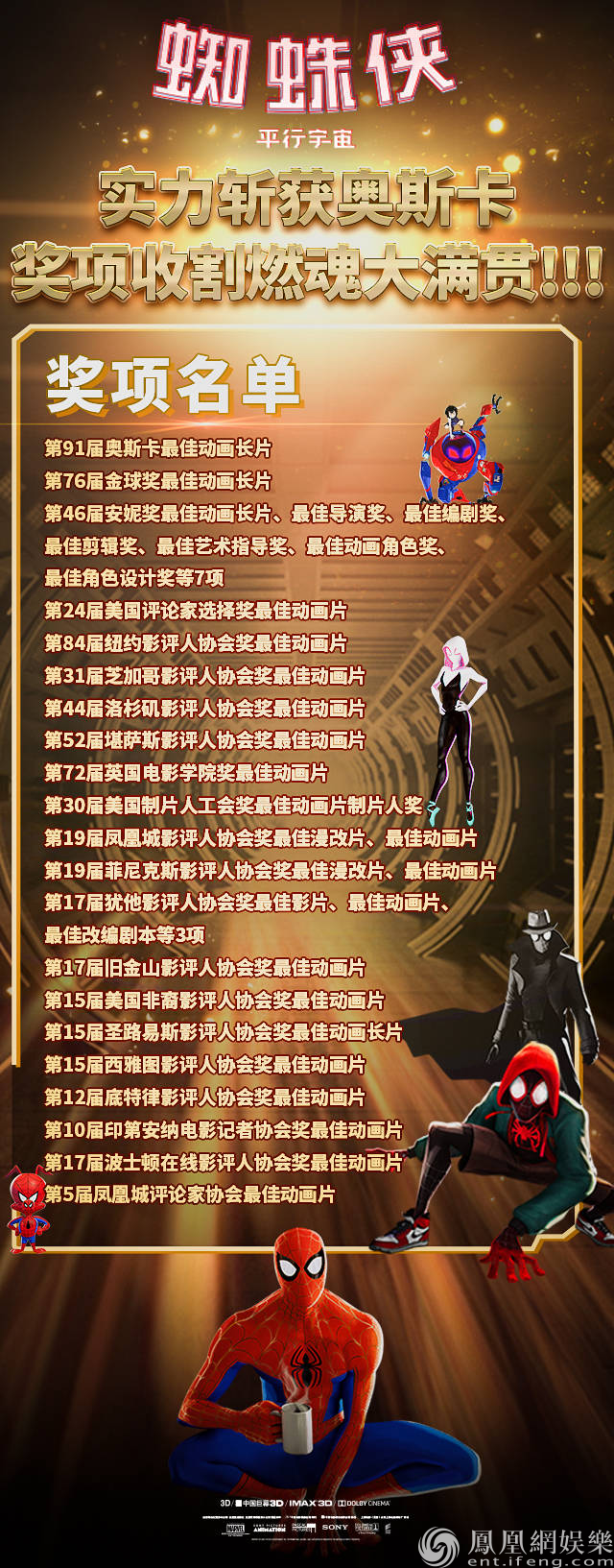 作為2018年索尼和漫威饋贈給影迷的賀歲大禮,《蜘蛛俠:平行宇宙》呈現(xiàn)出了最完美的視聽效果。本片不僅贏得了紐約影評人協(xié)會、芝加哥影評人協(xié)會、洛杉磯影評人協(xié)會等頒發(fā)的最佳動畫片獎,而且也獲得了第76界金球獎最佳動畫片獎,甚至拿到了動畫電影界最重要的獎項“安妮獎”的最佳動畫長片、最佳導(dǎo)演等在內(nèi)的7項大獎。當(dāng)然,最引人矚目的,還是它擒獲了第91屆奧斯卡最佳動畫長片獎,成為2018年最耀眼的動畫電影。