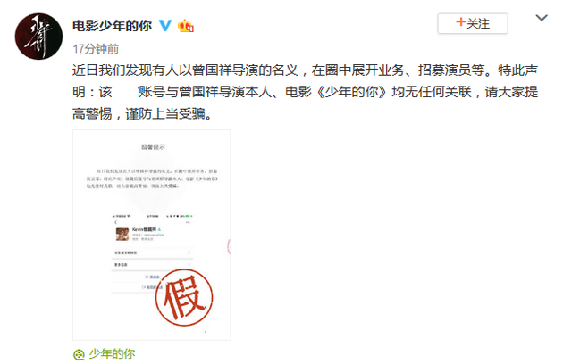 3月21日,電影《少年的你》官微在社交平臺上曬出一張聲明,發文稱:“近日我們發現有人以曾國祥導演的名義,在圈中展開業務、招募演員等。特此聲明:該賬號與曾國祥導演本人、電影《少年的你》均無任何關聯,請大家提高警惕,謹防上當受騙。 ”