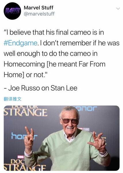 喬·羅素受訪時表示:“我相信《復仇者聯盟4:終局之戰》將會是斯坦·李老爺子最后一部客串作品。我不記得他的狀態是否能夠客串《蜘蛛俠:英雄遠征》”。