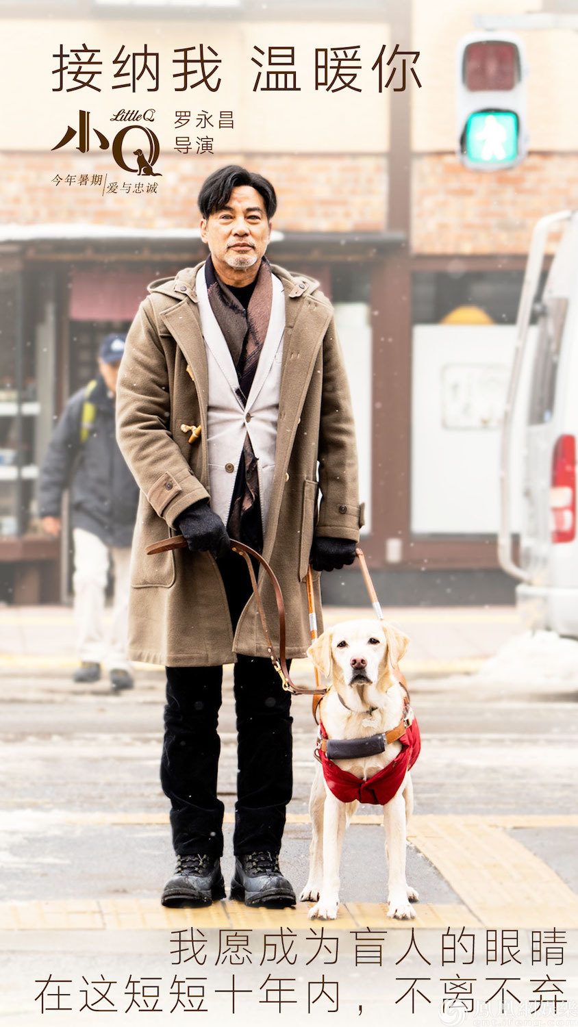 電影《小Q》改編自感動亞洲3億讀者的小說《再見了,可魯》,講述了聰明伶俐的拉布拉多獵犬小Q,從出生到訓(xùn)練成為導(dǎo)盲犬,終其一生為人類服務(wù)的故事。不同于原著,《小Q》將視角聚焦于中年失明的盲人李寶庭(任達(dá)華飾)與導(dǎo)盲犬小Q之間的人犬情深,展現(xiàn)了寶庭從一開始封閉自我,不接受小Q到最后打開心扉與小Q相依為命的動人情感,在平淡生活中,將人犬間細(xì)膩情感悉數(shù)展現(xiàn)。