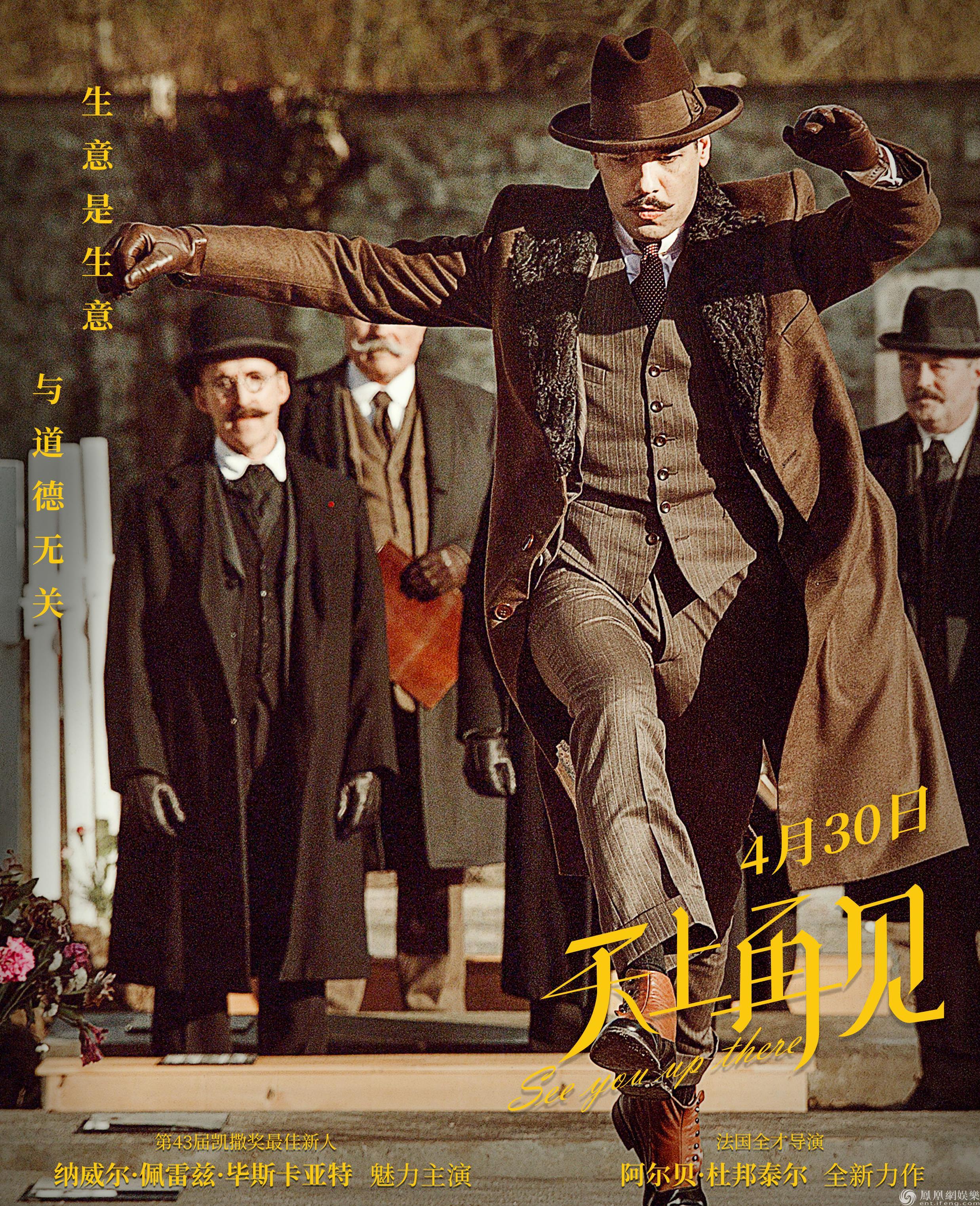 《天上再見》改編自法國殿堂級犯罪小說大師皮耶·勒梅特爾的同名小說,曾于2013年獲得有“法國諾貝爾文學獎”之稱的龔古爾文學獎。改編成電影后更是成績斐然,于2018年在有“歐洲奧斯卡”之稱的凱撒獎中共收獲13項提名,榮獲最佳導演、最佳改編劇本、最佳攝影、最佳服裝、最佳布景五項大獎。影片于法國上映后,更是掀起全境觀影熱潮,甚至得到了法國前總統歐蘭德親自出面邀請政商名流搶先觀賞的殊榮。國內上映后也得到了網友們的大力支持,不僅打出了8.0分的高分,還獲評“年度必看反戰佳片”,有望憑借超高品質在競爭激烈的五一檔內華麗逆襲。